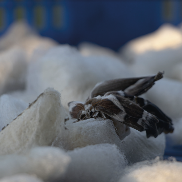 Eri silk comes from open ended cocoons, made by the unique semi domesticated silk worm Samia Cynthia Ricini, that allows the moth to escape. Hence, eri silk is often referred to as ‘peace silk’. The harvested fibres are not continuous like in mulberry and other natural silks. Hence, eri silk is spun and not reeled.